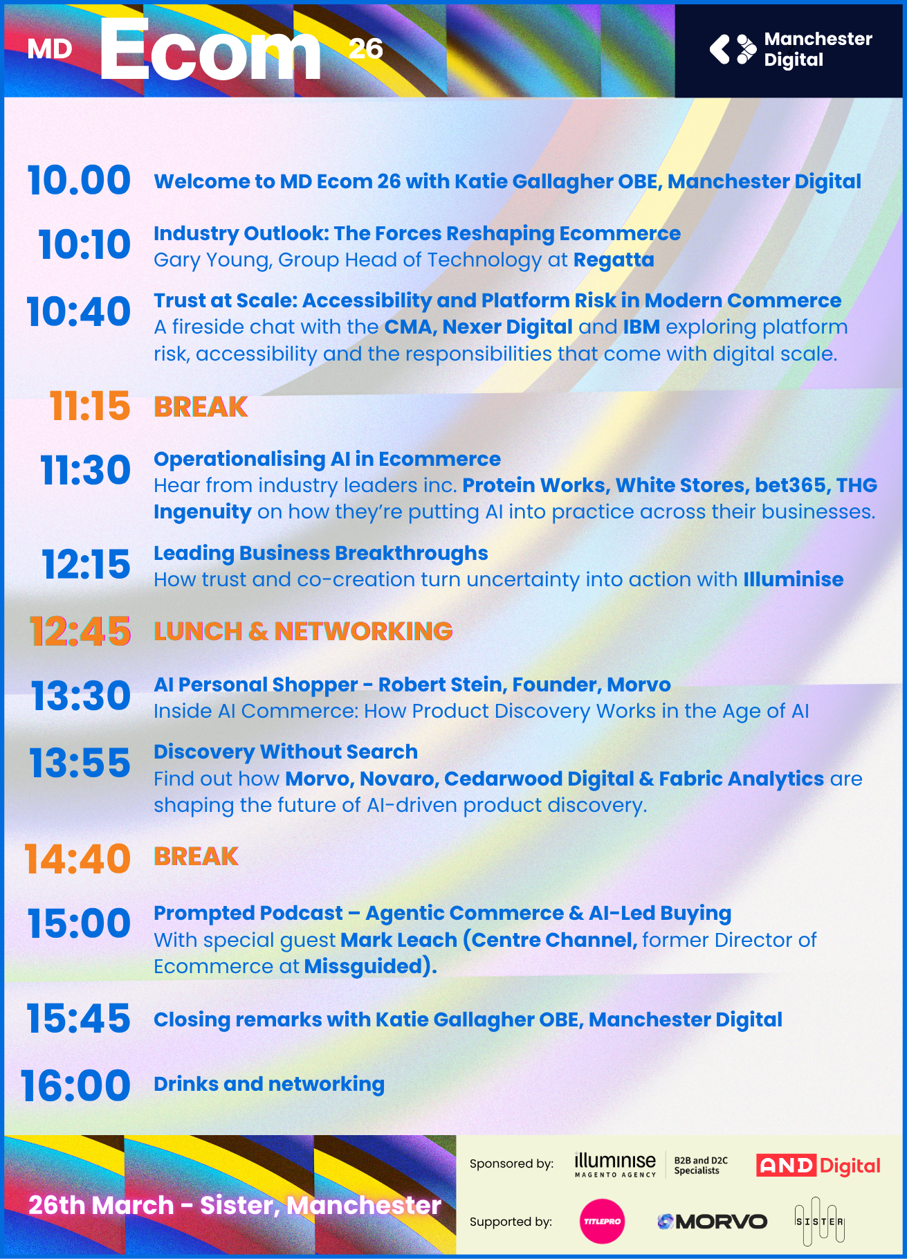 MD Ecom 26 is the largest senior ecommerce conference in the North West, bringing together leaders and decision-makers from retail, DTC, platforms and digital teams to explore how commerce is being reshaped in real time.