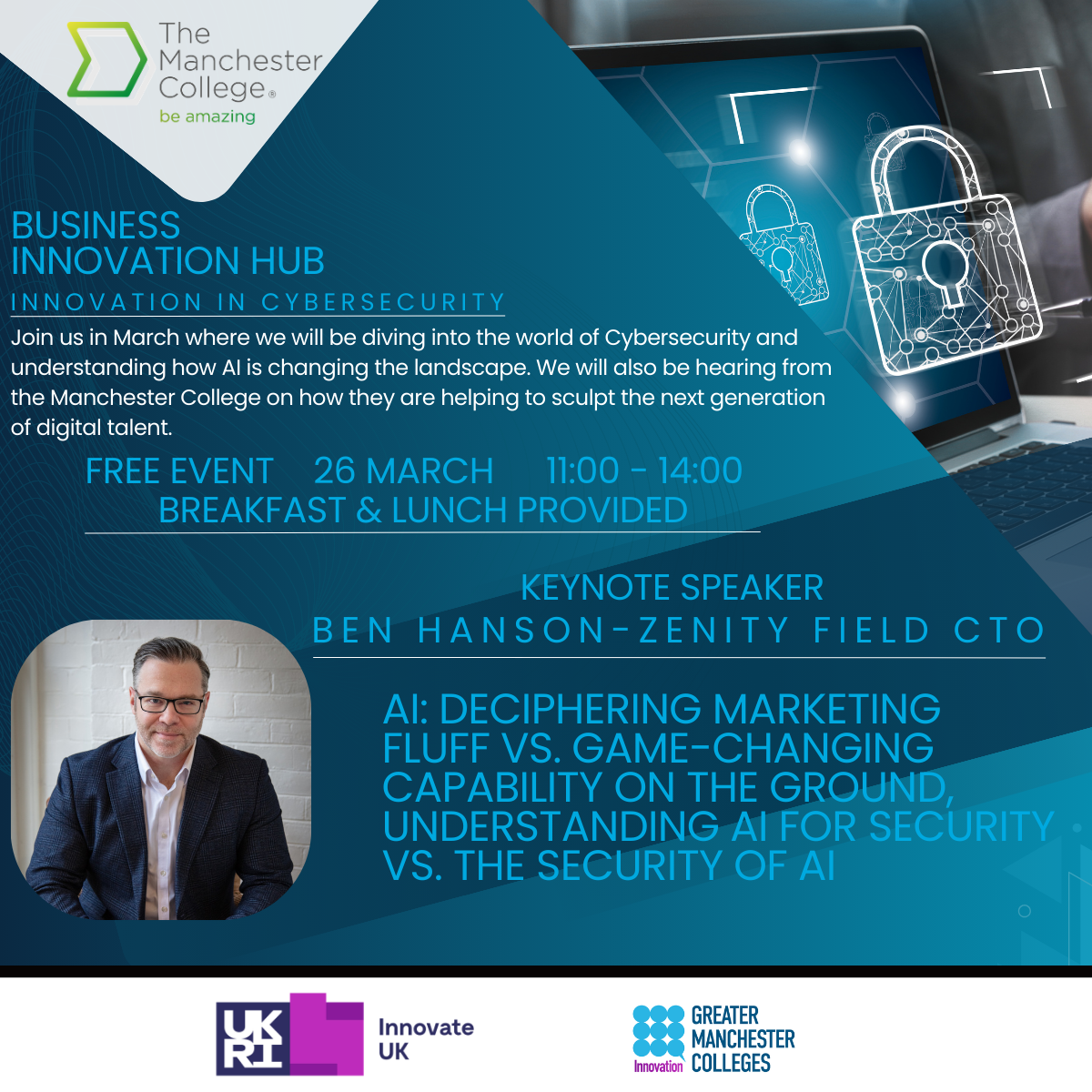 This March we will be diving into the world of Cybersecurity with our keynote speaker Ben Hanson, Global Cybersecurity Strategist, Field CTO at Zenity, Former Microsoft Senior Security Advisor & Visiting Cybersecurity Lecturer to understand how AI is changing the landscape and the real world imapct this can have on your business.
