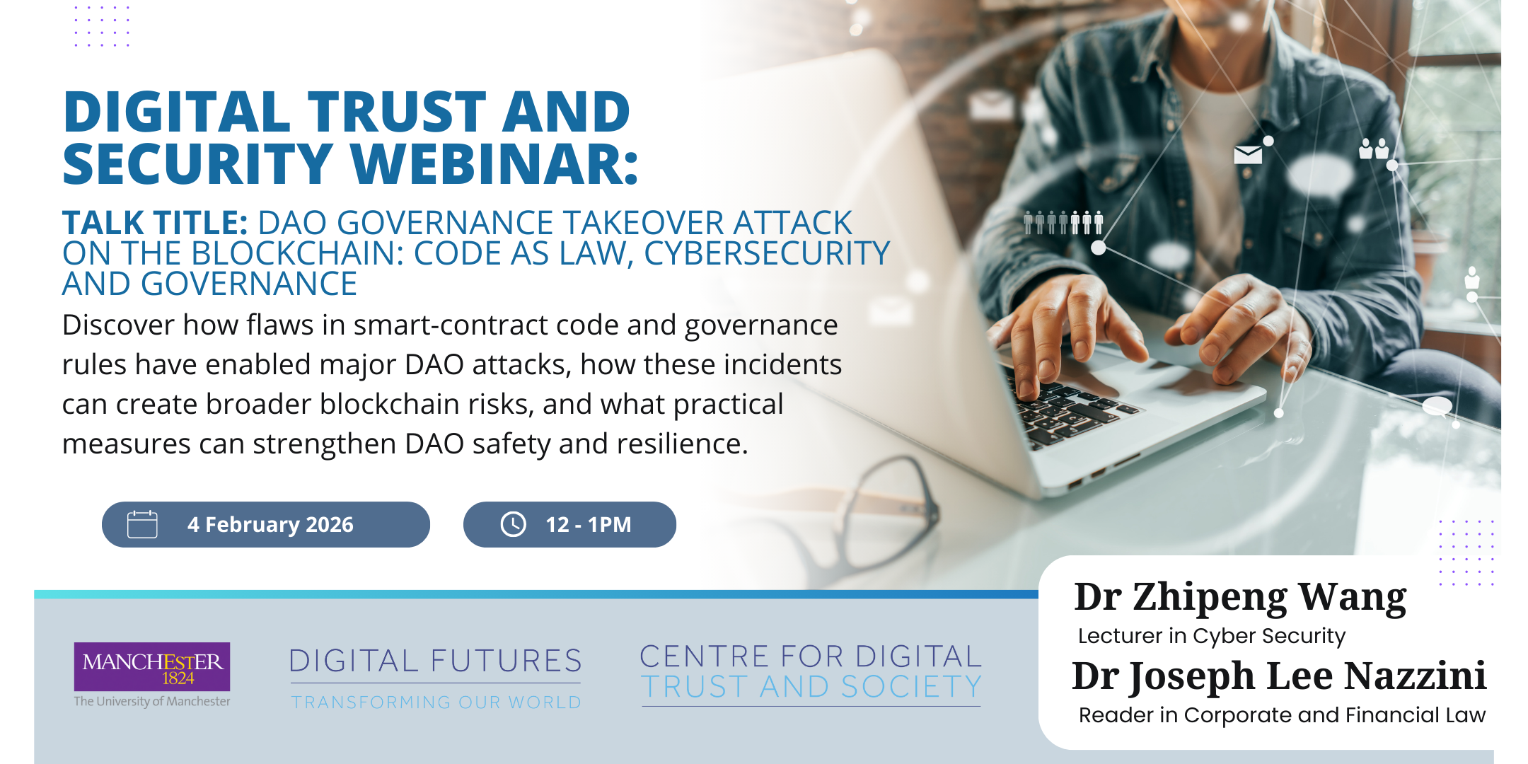 In this talk, Dr Zhipeng Wang and Dr Joseph Lee Nazzini analyse the DAO governance takeover attack as a major governance-level cybersecurity risk in blockchain systems, drawing on several cases, primarily the DAO Hack. Using historical examples, they demonstrate how flaws in both smart-contract code and governance design can create the conditions for DAO attacks. They further discuss how attacks on application-layer DAOs can, under certain circumstances, propagate systemic risks to the underlying blockchain. The talk also contrasts DAO governance attacks with 51% and other majority-based attacks on the consensus layer. Finally, they examine how code-as-law operates in the blockchain ecosystem, particularly in the context of DAOs, conceptualise what constitutes a ‘bug’ in deployed code, and propose measures to mitigate these cybersecurity risks.