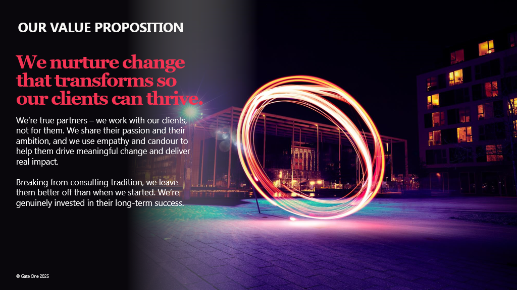 Gate One is the global business and digital transformation consultancy dedicated to helping clients thrive. Collaboration, creativity, grit and entrepreneurship are at the heart of our work to nurture change that transforms.