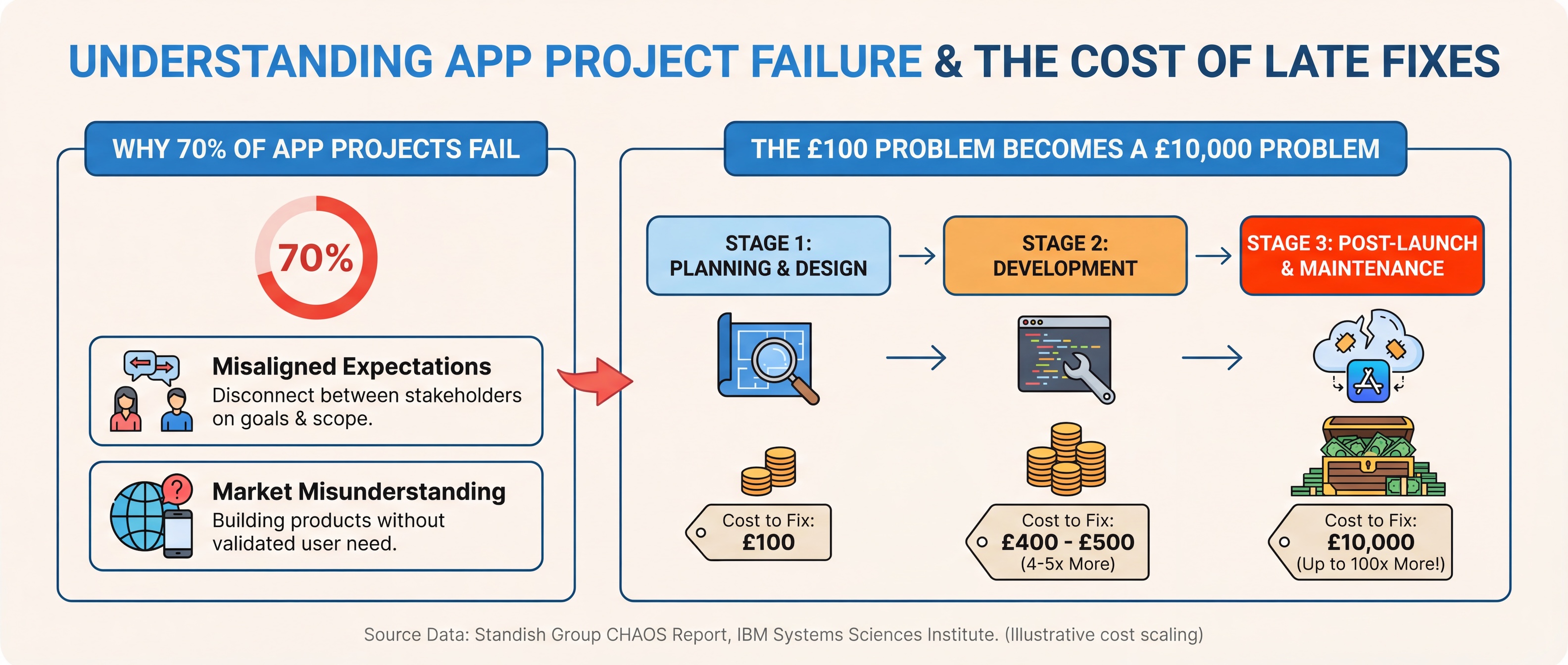 The statistics are stark. Research from the Standish Group shows 70% of app projects fail due to misaligned expectations and market misunderstanding. McKinsey reports IT projects run 45% over budget on average while delivering 56% less value than predicted. And IBM's Systems Sciences Institute found that fixing an error after release costs 4-5x more than catching it during design.