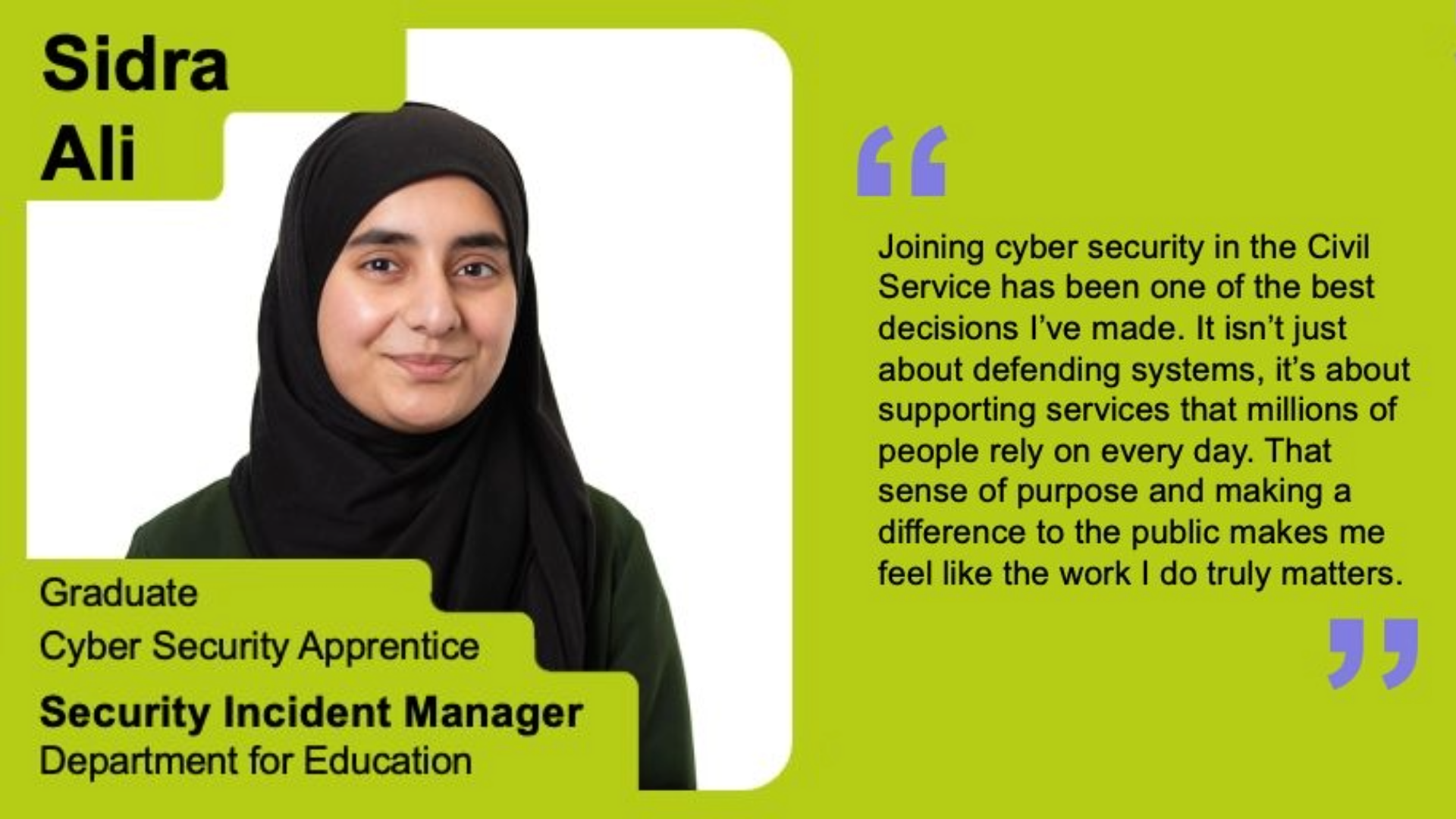 Apprentices like Sidra, who joined the Civil Service straight from sixth‑form college, highlight how TechTrack makes it possible to gain qualifications, learn on the job and build confidence in a professional cyber role while earning. You can watch Sidra share her experience here: