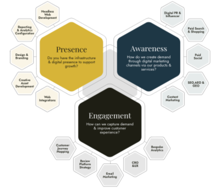 - Awareness: How do we create demand through digital marketing channels via our products & services?
