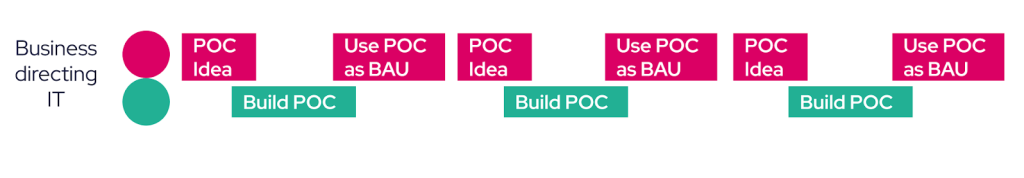 Whilst this may look like a successful approach on the surface, a combination of poor working relationships, organisational pressure, and lack of an overarching plan undermine its success. IT is now pushed to deliver multiple data projects that overlap in their data requirements, transformation processes, and outputs, yet are executed in isolation due to the lack of higher level planning. Enough work is done to get each concept off the ground – at which point, it is passed to the organisation for feedback – but with little-to-no time to move on to the next phase due to the pressure from other organisational areas.