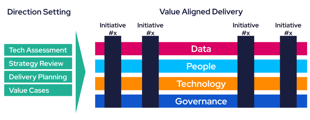 Using the vertical delivery approach, you would then consider up front what improvements are required across the key foundational data elements, i.e Strategy, Technology, People, Process, Governance, and Data. Delivering the lighthouse project wouldn’t target all of these areas at once, but would provide improvements to some; with the ability to then continue once the initial value has been shown and the organisation is happy to fund further work.