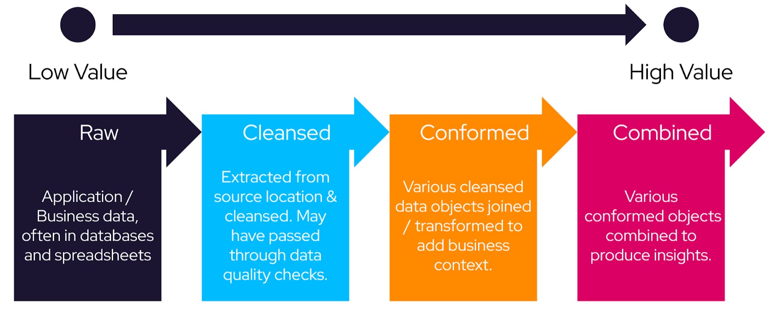 - Conformed: The refined data has been conformed into a usable structure, where it can be used in isolation or combined with other finished components.